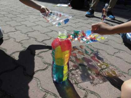 2年生は図画工作科お家にある透明なものに,カラーセロハンを貼ってきれいな「光のプレゼント」を作りました。光にかざすと幻想的な光が広がり,うっとりしました。