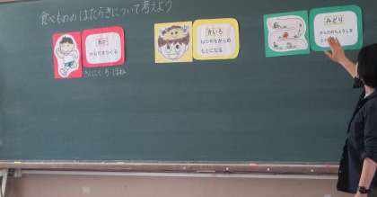 第1回目の栄養教諭の田口先生との授業は、「食べもののはたらき」についての学習をしました。