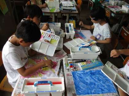 3年生は図画工作の時間に,あじさいのちぎり絵を作る準備をしていました。今日は,ちぎってあじさいの花びらにする半紙に絵の具で色を塗っていました。自分が表現したいあじさいの花の色を考えて塗っていました。