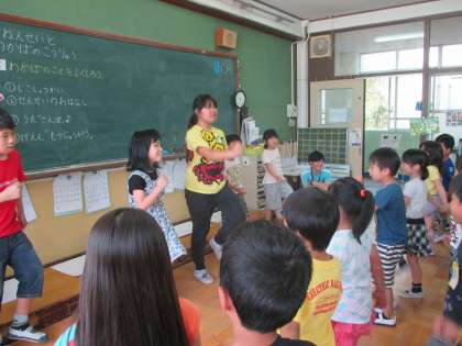 わかば学級の子の紹介から始まり、みんなで「さんぽ」を歌ったり、「猛獣狩り」のゲームをしたりして楽しく交流しました。