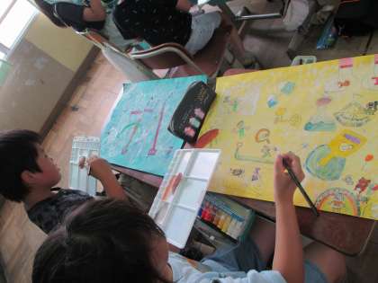 下書きした絵に絵の具を使って丁寧に塗っています。