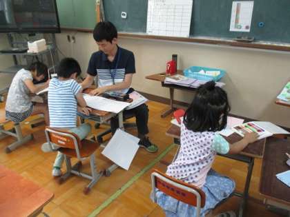 わかば学級では個別の学習をしていました。低学年は算数の学習を,中高学年は国語の学習をしていました。先生に丸つけをしてもらいながら,集中した様子で取り組んでいました。