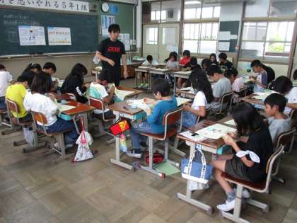 5年生は家庭科の時間に「ひと針に心をこめて」の学習をしていました。この時間は針に糸を通して玉結びをしたり,練習布を使ってなみ縫いの練習をしたりしました。初めて針と糸を使った子どもたち。「難しいなあ。」と感じている子どもや「楽しい!」と言いながらどんどん縫い進める子どもがいたりと,それぞれに感想をもっていました。