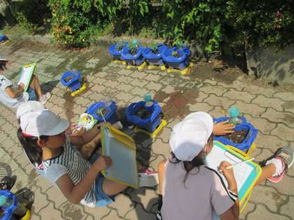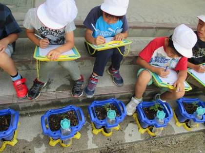 「葉っぱがトマトのにおいがするよ。」「もっと伸びてほしいな。」