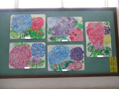 3年生が図画工作科で取り組んでいたあじさいの花が完成しました。いろどりの美しいあじさいが咲きました。紙に描いて貼ったカタツムリの模様や表情もかわいいです。