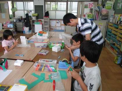 わかば学級では,図画工作科の時間「なにが出てくるかな」の学習をしています。ストローを吹くと,ストローの先についているビニールの袋に空気が入り,箱の中からビニール袋が出てくる仕組みです。箱の飾りやビニール袋の先につけるものを工夫して,楽しい箱にしていきます。