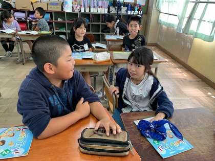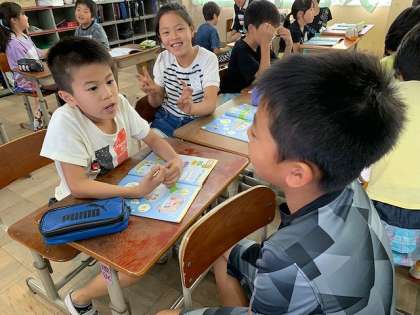 外国語活動では,遊びや天気の言い方に慣れ親しんだり,好きな遊びを伝え合ったりする活動をしています。「What Kind of do you like?」「I like soccer.Do you like soccer?」「Me,too.」と好きな遊びを楽しく伝え合っています。