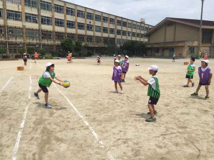 今,体育科で「エンドボール」の学習をしています。「パス!パス!」と積極的にチームで声をかけ合い,どんどんパスが回せるようになってきました。シュートが決まると,「やったー!」と飛び跳ねて喜んでいます。