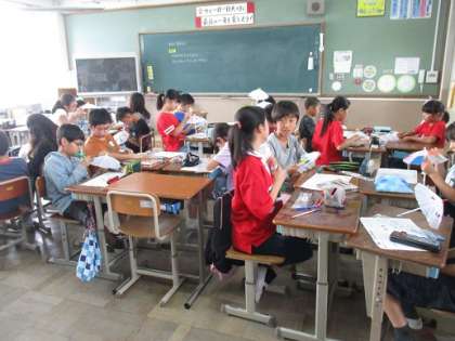 6年生は図画工作科の時間に,小さな傘におしゃれな模様を描いていました。傘の特徴を生かして,模様を工夫しています。自分が表現したいものを描いたオリジナルパラソルを作っていきます。