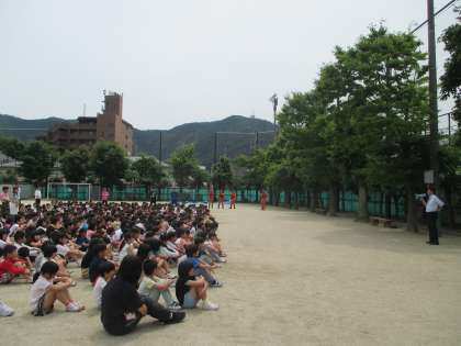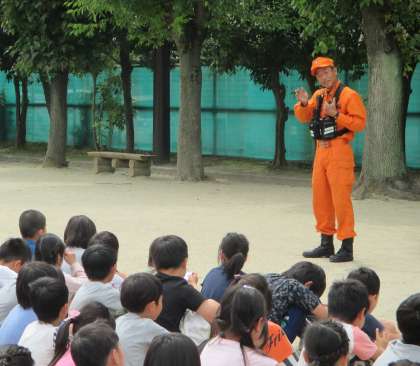校庭に避難した後は、校長先生と山科消防署の方からお話をしていただきました。