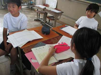 「聞き手」、話し手」、「記録者」のそれぞれの役割に分かれ,交代でインタビューをしました。相手の好きなことを上手に引き出し、メモをしています。