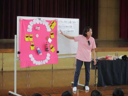 2年生は,2時間目に歯科衛生士さんに歯みがき指導をしていただきました。甘いものを食べたり食べかすが残っていたりすると,むし歯菌が増えて歯に穴が開き,むし歯になることを教えていただきました。
