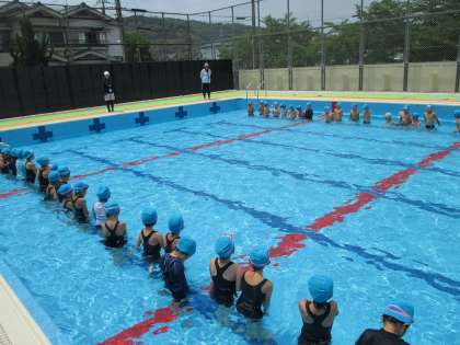 1年生は水位が上がって初めての水あそびです。前よりも水位が上がってドキドキの1年生でしたが,今日は初めてバディを組んで新しいことに挑戦しました。