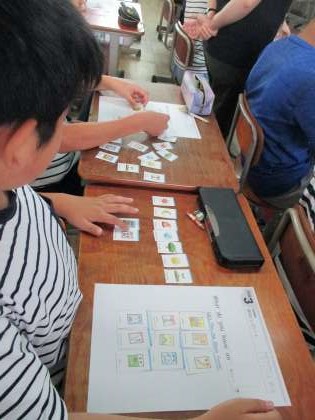 18枚のカードの中から9枚を選んでマスに置いていきます。グリーン先生が選びそうなカードを予想しながら楽しく選んでいます。英語の指示を聞いてゲームができるところがさすが5年生です。