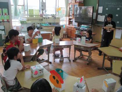 箱とストローを使ったしかけのあるおもちゃです。ストローから息を吹き込むと,箱に入っている袋に空気が入り,箱から飛び出すしかけになっています。箱のまわりには,ドラゴンや果物,お花など好きな絵を描いています。