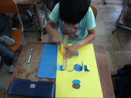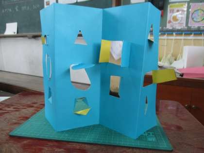 厚紙にカッターで切れ目を入れて,窓を作りました。自分が作りたい窓の大きさや形を考えて下描きをし,ものさしを使いながら,安全に気を付けてカッターで切れ目を入れていきました。