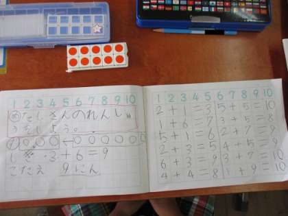 算数の時間に,たし算の練習をしていました。数図ブロックを使って確かめながら正確に計算ができていました。