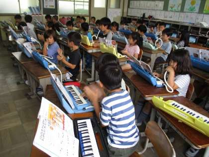 2年生は音楽の時間に,「かっこう」の鍵盤ハーモニカの練習をしていました。クラスの半分の人は3拍子のリズムを打ち,半分の人は鍵盤ハーモニカの演奏をしたりもしました。