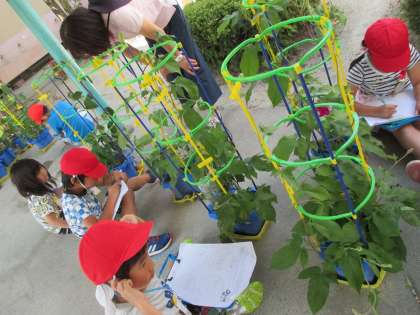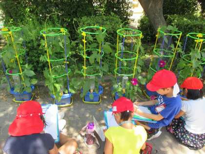 1年生は生活科の時間にあさがおの観察をしました。つるがぐんぐん伸びて,つぼみがたくさんついています。「7個もあったよ。」とつぼみの数を数えたり,「つぼみの形はクリームみたい。」と形の面白さに気付いたりと,初めてのつぼみに興味津々です。