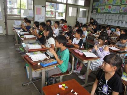 曲の後半は歌のグループとリコーダーのグループに分かれて,お互いの音を聞きながら音を重ねていました。子どもたちは,拍の流れにのって気持ちよさそうに歌っていました。