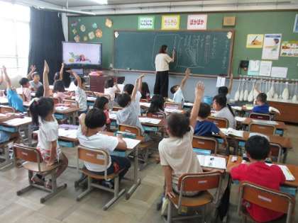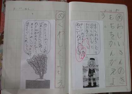 1年生の国語科では,「おおきな かぶ」の学習をしています。みんなで繰返し元気な声で音読をした後,かぶの気持ちを考えて発表しました。