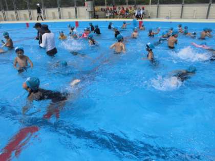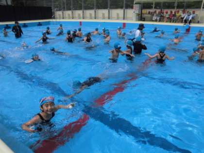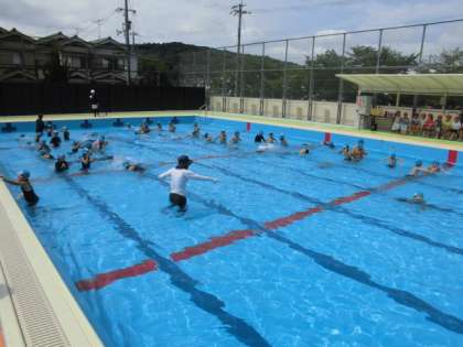今日は1年生最後のプールです。浮いたり,もぐったり,ずいぶん水と触れ合うことに慣れてきました。最後はみんなが大好きな碁石拾いです。プールにたくさん沈んでいるお宝を我先にと拾います。どっちのクラスが多く拾えるでしょうか?