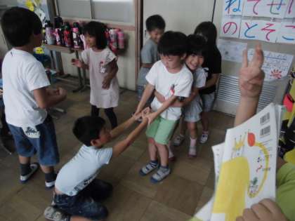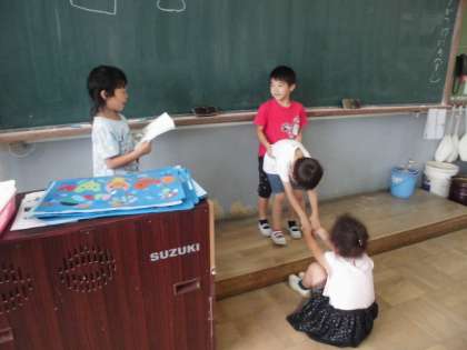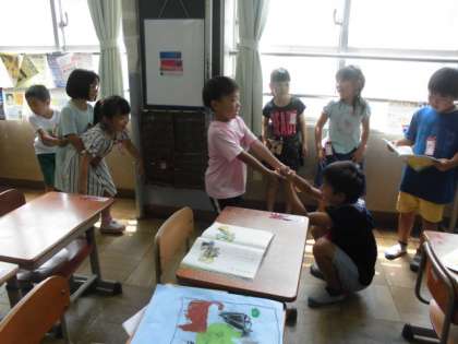 おおきなかぶの音読劇の練習です。「うんとこしょ,どっこいしょ,それでもかぶはぬけません!」登場人物が増えていくたびに,声が大きくなっていきます。演技にも熱がこもりますね。