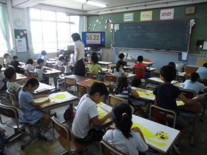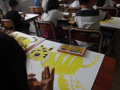 お話の絵の制作が進んでいます。黄色い虎が画用紙いっぱいに描かれています。なるべく白いところが残らないように,クレヨンで丁寧に塗りつぶしていきました。