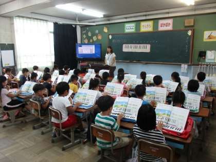 1年生の音楽の授業では,けんばんハーモニカの練習が始まっています。今日はオルガンに合わせて1つの音を鳴らしてみました。