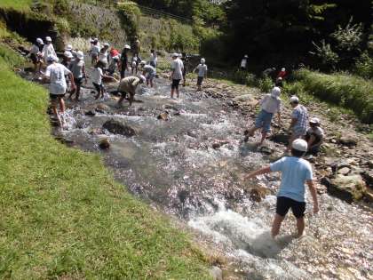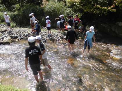 川遊びがはじまりました。水が冷たく足をつけるだけで気持ちがいいです。はじめは足をつけていただけですが,水のかけあいっこが始まり,みんなズクズクになりました。でも気持ちがいいので気にしません!
