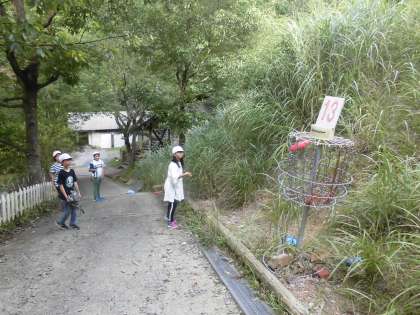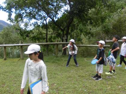 午後の2つ目の活動はフライングディスクゴルフです。約6人のグループでコースを回り,ゴールをめがけてディスクを投げます。順番を守って仲良く活動できました。友達がディスクを投げるのを見守る姿から,優しさが感じられました。