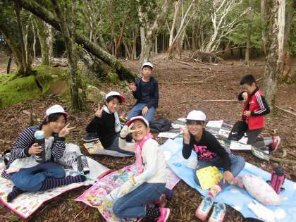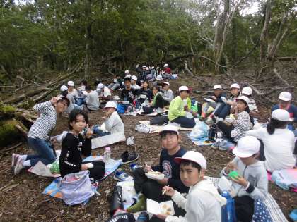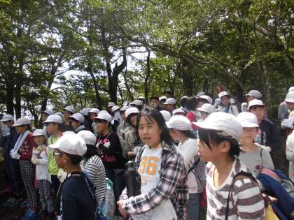 いよいよ頂上に到着です。山の家に向けて「ヤッホー!」と大きな声で呼びかけます。みんなの声は山の家で待っている校長先生まで届きましたよ。