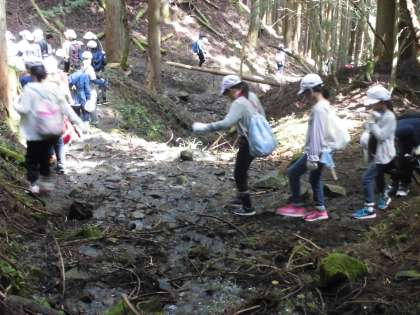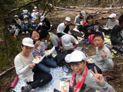 頂上では,おにぎり弁当を食べました。達成感に充ちたいい顔をしていますね。下りはぬかるんだところもあったようですが,午後1時半ごろに全員元気に帰ってきました。よく頑張りましたね!