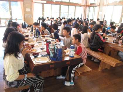 今日は17時から夕食でした。食堂の使い方にもすっかり慣れた様子の子どもたち。ルールを守って,おかずをよそったり食器を返したりできるようになりました。