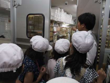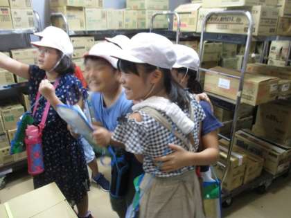 お店のバックヤードも見せてもらいました。牛乳などが保管されている冷蔵室,アイスクリームなどが保管されている冷凍室にも入らせていただきました。冷凍室はマイナス20度!「寒い〜!」「探検ボードた冷たくなった。」と子どもたちも驚いた様子でした。