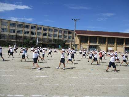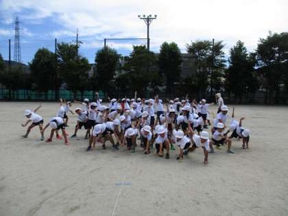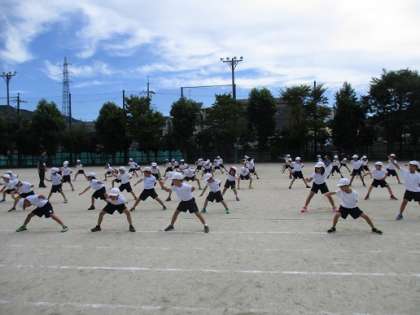 2年生は運動場で運動会練習をしています。本番と同じ隊形で最初から最後までの動きや並び方を音楽に合わせて確認しました。「ヤー!」という元気な声が響いていました。