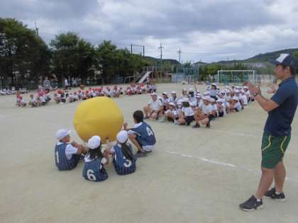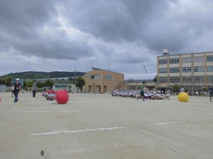 「大玉ころがし」の様子です。たてわりのグループで大玉を転がし,早くゴールした組の勝利です。