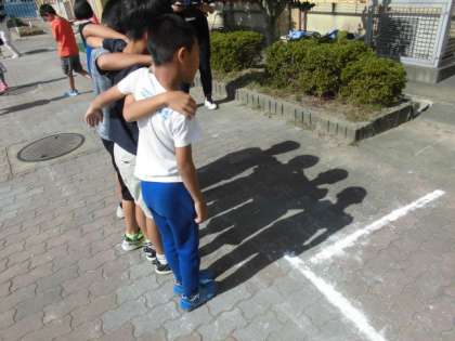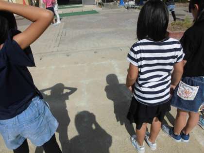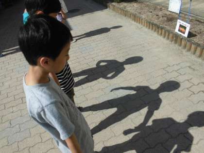 ちぃちゃんのかげおくりの学習が始まりました。外に出て実際にかげおくりをやってみます。「しろいのがうつった!」と、かげおくりを身をもって経験することができたようですね。