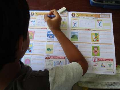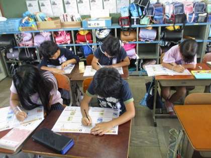 3年生はローマ字の練習ノートを使ってローマ宇の練習をしていました。「曲がった線を書くのが難しいねん。」と言いながらも,お手本を見ながら丁寧に書いていました。