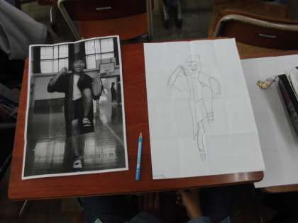 運動会で踊った「エイサー」の衣装を着て好きなポーズをとり,その版画を作ります。今日は版の下描きをしました。かっこいい版画ができそうですね。
