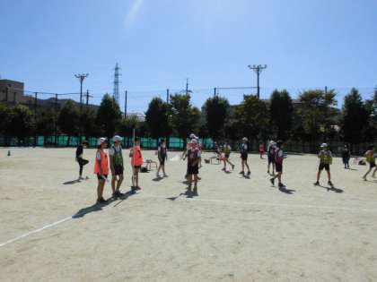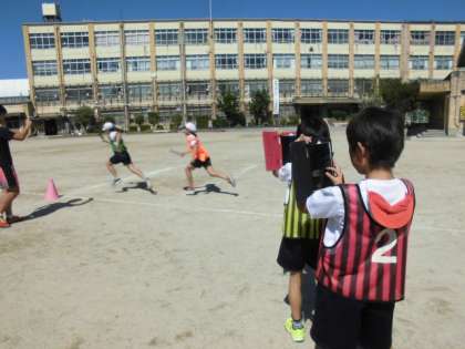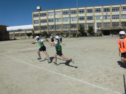 リレーの練習をしています。リレーの要になるのはバトンパス。一生懸命練習していたチームが新記録を出しました!他のチームにも火が付き,負けじと走ります。