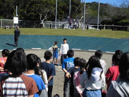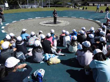 校歌を歌いながら小野小学校の旗をあげ,所員の方からのお話を聞きました。