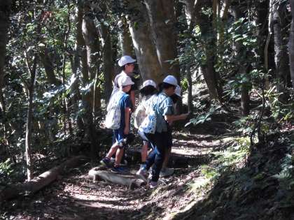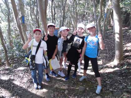 浦山ラリーでは,浦山にある自然のものや木の名前を探しながら,コースを歩いていきます。上り下りのある山の中のコースを班で協力して進んでいきます。途中でサワガニを見つけることができたようですよ。