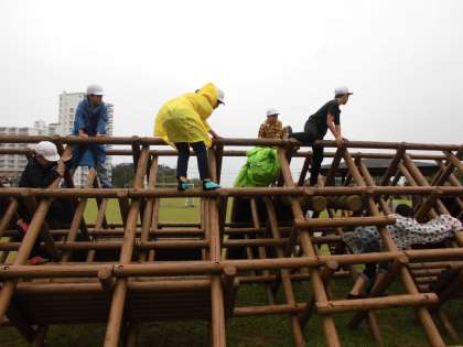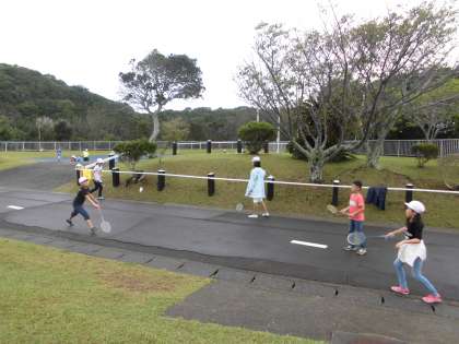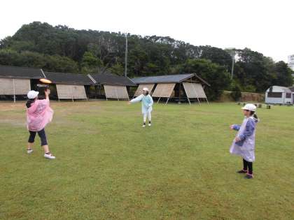 雨がやんだので,芝生広場で自由に遊びました。バドミントンやサッカーボール,フリスビーなどを借りることができました。