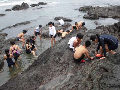 天気が回復してきたので,麦崎まで約30分ほど歩いて行き,磯観察をしました。磯にはカニをはじめ,様々な種類の貝,小さな魚などの生き物がたくさんいました。