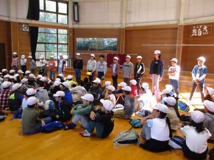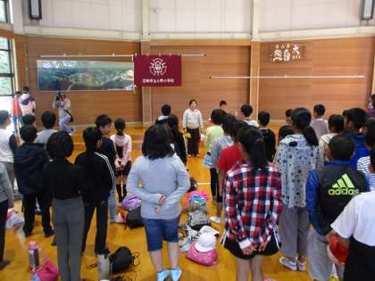 退所式の様子です。校歌を歌いながら校旗をおろしました。みさきの家の所員さんにお礼を言い,頑張ってくれたリーダーさんに拍手をしました。2日間お世話になったみさきの家ともお別れです。「まだ帰りたくないな。」と名残惜しそうにしている子どももいました。