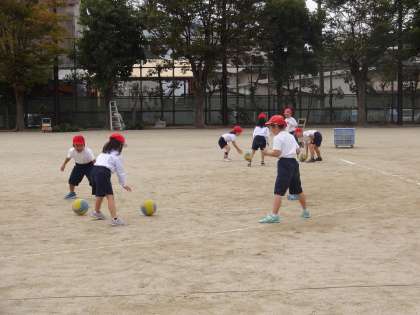 ボールあそびでは,パスやキャッチの練習をしてボールに慣れるように頑張っています。