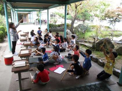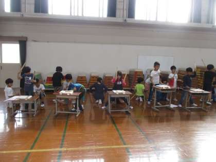 2年生の元気な掛け声とバチでリズムを刻む音が聞こえてきました。3つのグループに分かれて練習をしています。先生の話を真剣に聞いて練習に励みます。