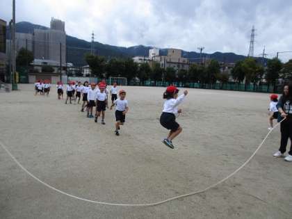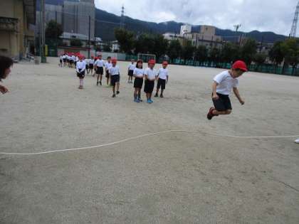 先生が回す大なわをくぐったり跳んだりします。回るなわをよく見てタイミングを合わせてくぐるのはドキドキしますね。みんな楽しそうでした。