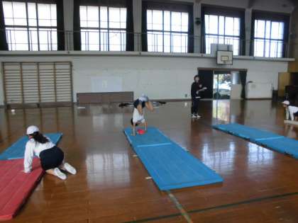 マット運動の学習が始まりました。マットの上でロバキック・かえるの足打ち・川跳び等,体ならしを行いました。